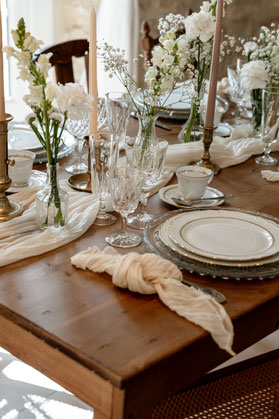 Chaque pièce de vaisselle, chaque chaise, chaque bougeoir a été choisi pour son charme et son histoire.